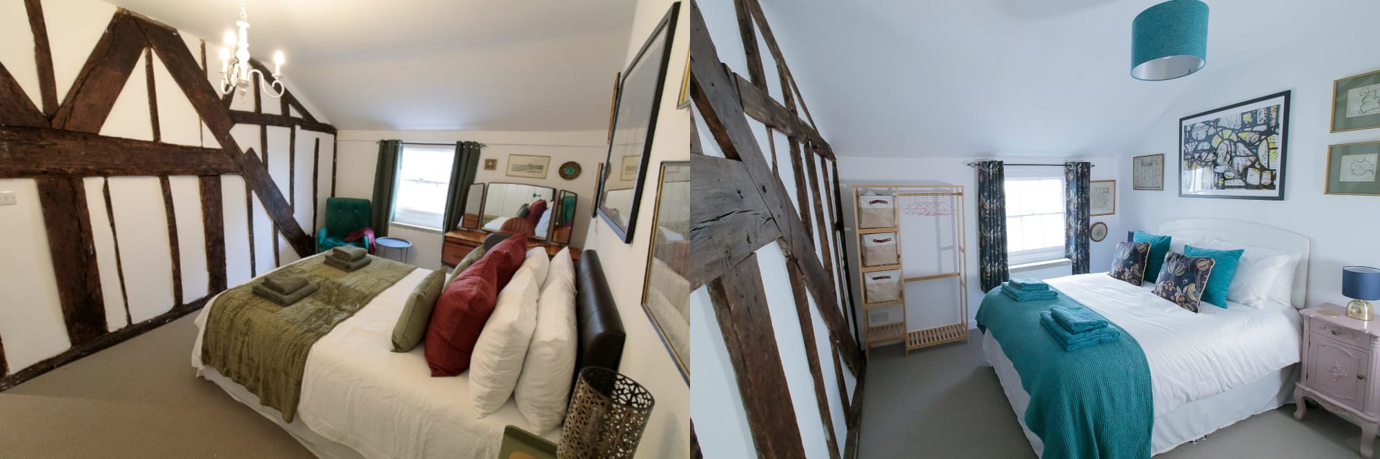Two double bedrooms in a Grade II listed Tudor building in the heart of beautiful Ludlow town. Both rooms feature original Tudor woodwork with modern fittings, comfortable beds with cotton sheets, plenty of storage, tellies and high speed internet. The rooms are served by a shared bathroom and kitchen.
